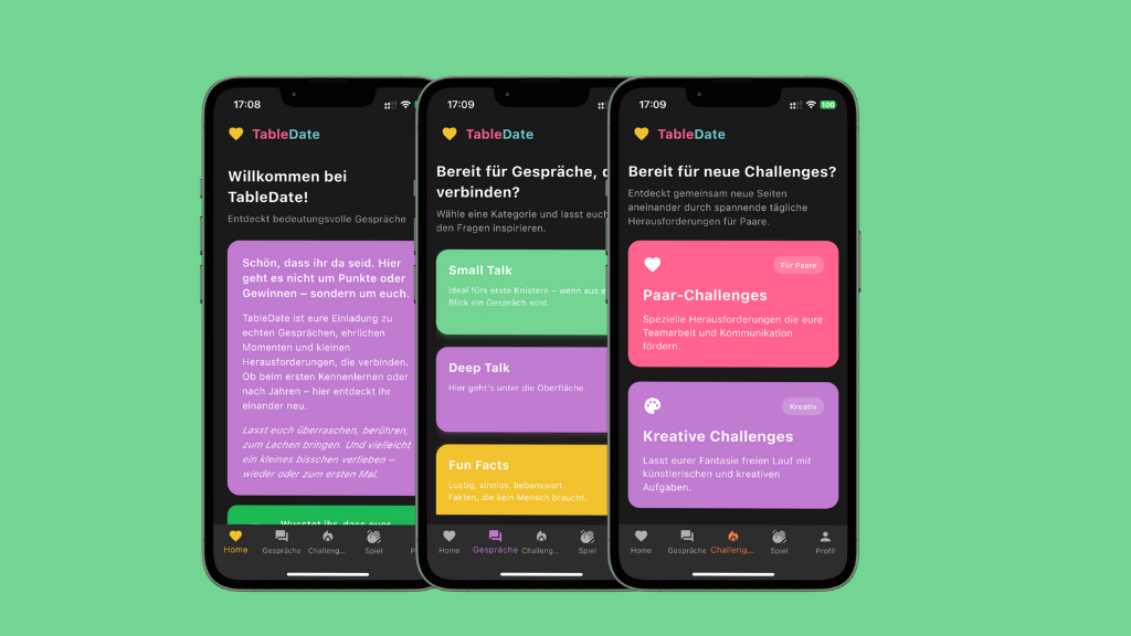 Auf einem großformatigen Spielfeld entfaltet sich euer persönlicher Date-Abend: mit kreativen Challenges, tiefgründigen Fragen und witzigen Mini-Games. Unterstützt von unserer kostenlosen App (iOS & Android) begleitet euch TABLEDATE durch einen Abend voller Nähe, Lachen und echter Gespräche.